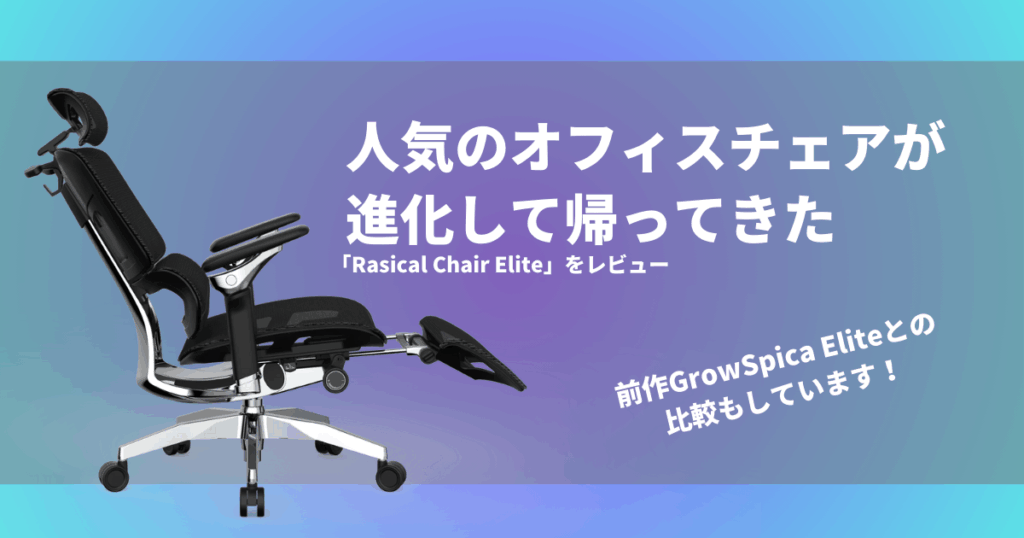 高機能オフィスチェア「Rasical Chair Elite」をレビュー。実際に使用した筆者が、メリット・デメリットを正直に解説。前モデル「GrowSpica Elite」との違いも踏まえ、購入前に知っておきたい座り心地や可動性、静音性を徹底検証します。 -